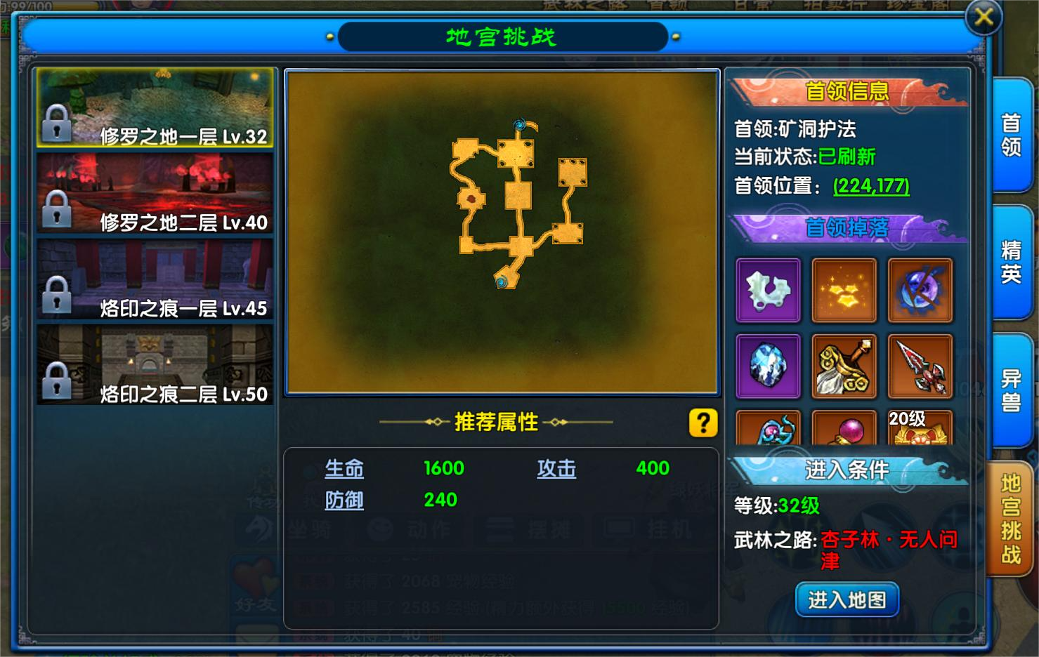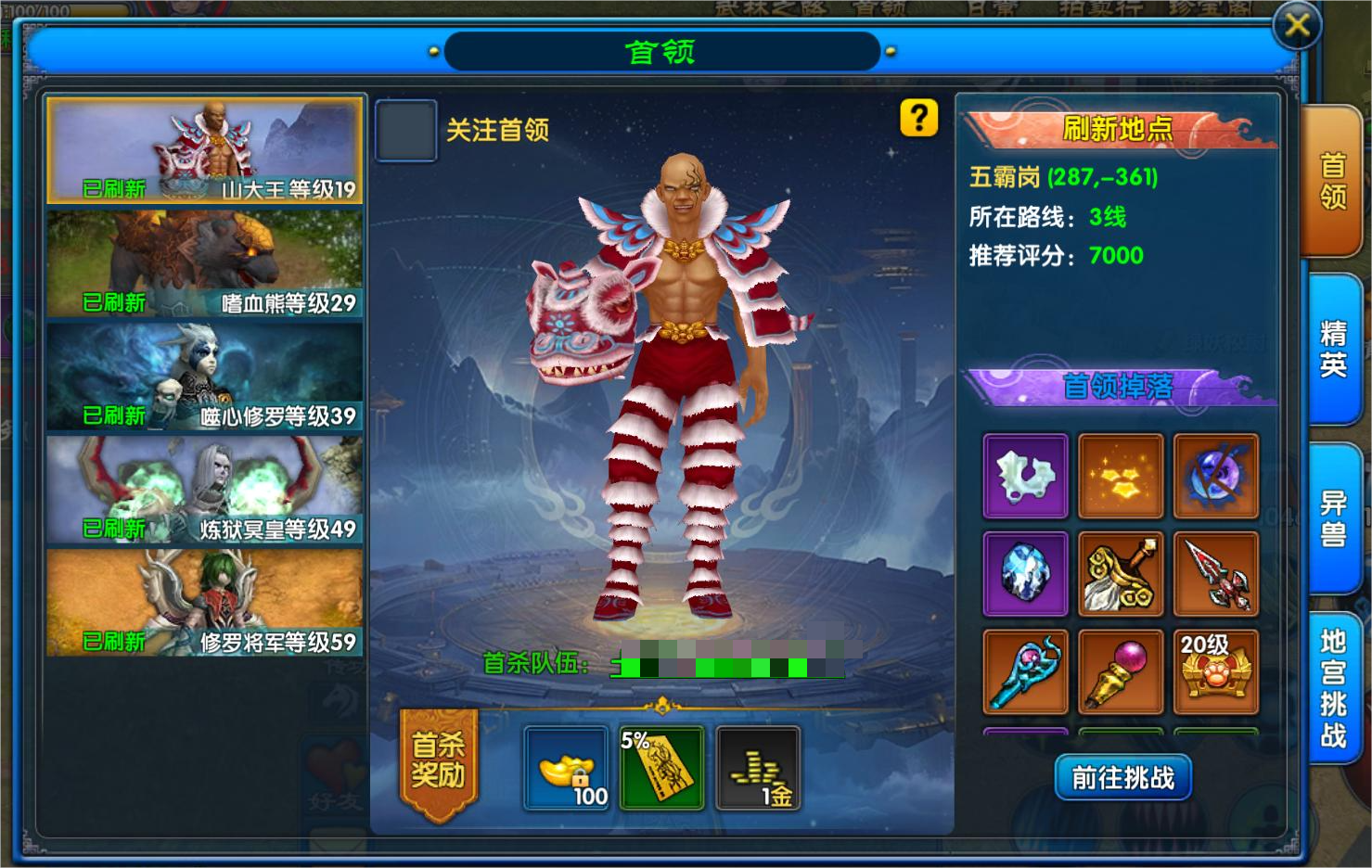 在这片广阔的武林天地中,想要快速提升实力、获取珍稀资源,挑战散布各处的强大首领无疑是必经之路。从威震一方的首领到神秘莫测的异兽,从实力强悍的精英到机关重重的地宫,每一次挑战都是对少侠胆识与实力的试炼。江湖不仅充满了欢声笑语与侠骨柔情,更遍布着机遇与挑战!等待着有胆识、有谋略的少侠前来征服。 首领挑战对应首领并击败即可获得对应奖励。完成首杀的队伍和玩家将获得首杀奖励,但玩家挑战等级不足首领挑战等级时,即使组队挑战也不计入首杀列表并且无法获得首杀奖励。 击败首领可获得传说品质装备、首饰、传说装备材料等丰厚奖励。 ![]() 精英挑战精英怪物并击败可获得首饰装备、宠物装备、传说装备材料等丰富奖励。精英怪物实力较为强悍,建议准备完善后再去挑战。 与首领不同的是,每个精英怪物在地图不同线路都会刷新,大家可以切换线路进行多次挑战。 ![]() 异兽挑战异兽并击败也会获得首饰装备、宠物装备、传说装备材料等丰富奖励。需要注意的是异兽刷新后会在场景里自由移动,大家请耐心寻找哦~ 与精英怪物相同,每个异兽也会在地图不同线路都会刷新,大家可以切换线路进行多次挑战。 ![]() 地宫挑战地宫挑战中达到对应等级以及完成武林之路中的指定章节,即可进入挑战。地宫怪物拥有强大的控制效果,达到对应推荐抗性后可无视对应的控制效果。 击败地宫首领将获得传说品质装备、首饰、传说装备材料等丰厚奖励。 ![]()